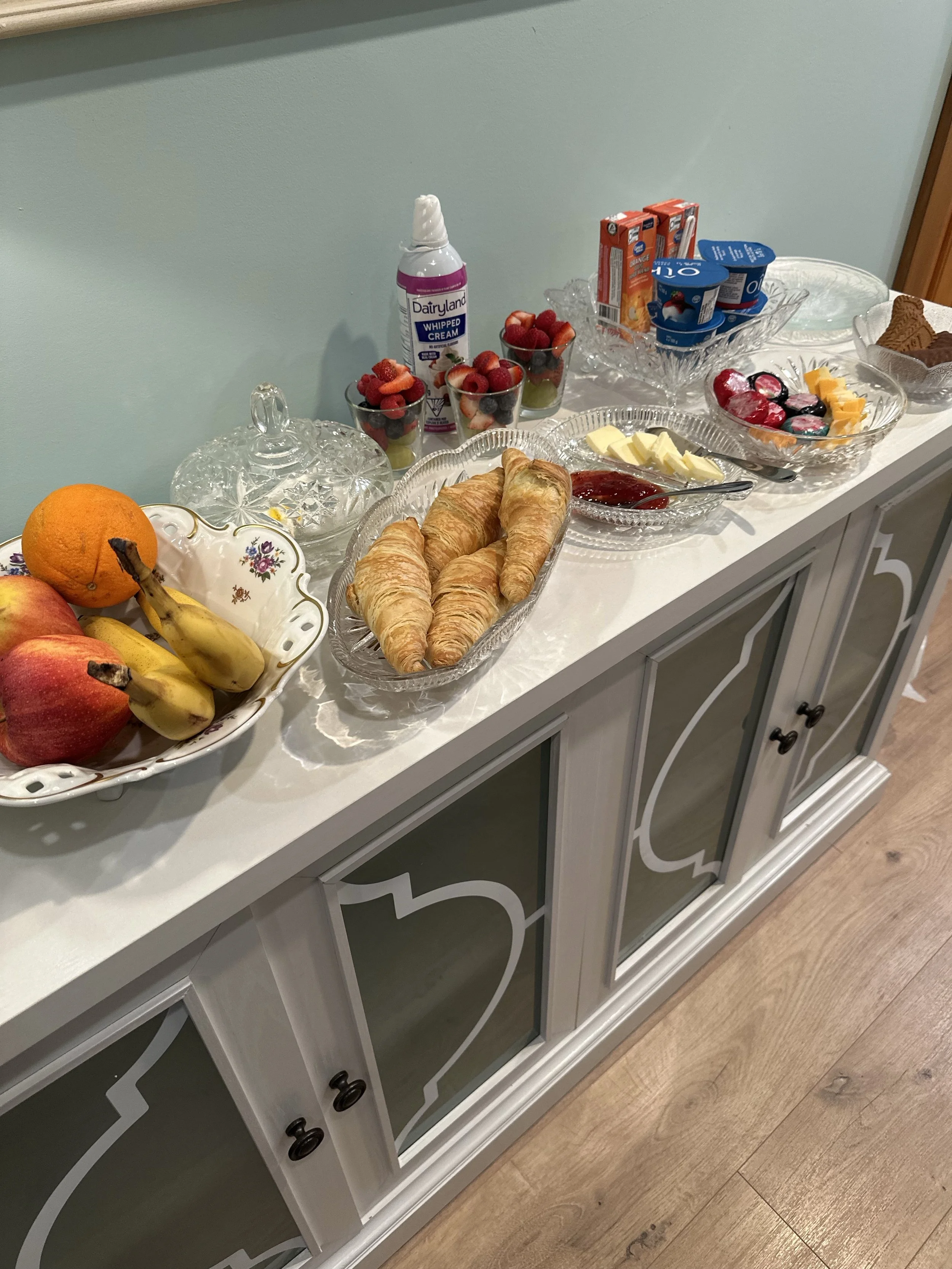 Enjoy fresh coffee, croissants, eggs ,fruit cups , cheese and yogurt served in a buffet style each morning!